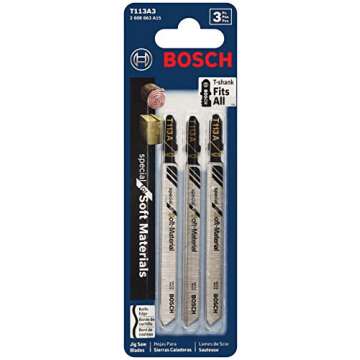 BOSCH T113A3 3-Pack 4 In. Knife Edge T-Shank Jig Saw Blades Ideal for Applications in Soft Materials, Cardboard, Leather, Carpeting, Polystyrene