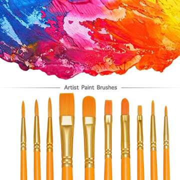 Show more Unleash your creativity with this exceptional set of 10 various sizes of artist paintbrushes. Perfectly designed to accommodate any artistic endeavor, these brushes include a delightful assortment of shapes - from pointed round to angular, filbert, flat, and liner/rigger. Ranging in length from 17.5 cm to 19.5 cm (6.9 to 7.7 inches), they are the ideal tool for everything from bold strokes to intricate detailing. Whether you're a seasoned artist or just embarking on your creative journey, this paintbrush set meets all your painting needs.