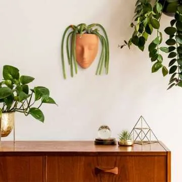Show more This Show Stopper planter is not just a piece of decor; it's a statement! Crafted to bring a touch of nature and tranquility into your living space, this unique wall planter serves as an ideal canvas for your creativity. With dimensions measuring 6.9 inches tall, 5.4 inches wide, and 3.6 inches deep, it features a head planter cavity perfectly sized at 4.75 inches wide and 5 inches deep, making it versatile enough to hold up to 2.75 cups of soil. Constructed from durable cement, paired with a sturdy metal hanger, this planter promises longevity and visual appeal.