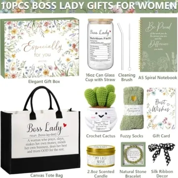 Show more Celebrate the exceptional women in your professional life with the **MAYICIVO Boss Lady Gifts for Women**. This thoughtfully curated gift box seamlessly combines elegance and utility, making it an ideal choice for any occasion where expressions of appreciation are in order. Whether it's for **Boss's Day, a birthday, or simply to show your gratitude**, this stunning collection includes all the essentials to have her feeling cherished and supported. The delightful contents, packed with care, showcase your thoughtful side while providing practical gifts that any boss lady would love to have.