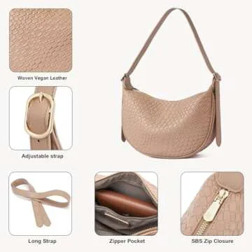 Show more Introducing the BOSTANTEN Purses for Women: a small crossbody bag that blends style, functionality, and elegance into one beautifully crafted accessory. Made from high-quality vegan leather, this purse is not just a trendsetter; it is a smart choice for those who value sustainability and durability. With its chic crescent shape and soft apricot hue, this handbag captures a retro charm that fits seamlessly into modern wardrobes. Its compact dimensions of 10.4 x 3.3 x 6.9 inches make it the perfect companion for both casual outings and formal events, ensuring you look stylish without compromising on practicality.
