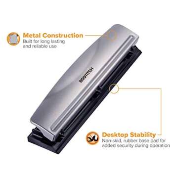 Show moreIntroducing a revolutionary office companion that will elevate your organizational skills to new heights! This all-metal designed hole punch, from a trusted brand, offers unparalleled durability and performance. Say goodbye to flimsy tools that can't stand the test of time. This hole punch features an easy-to-clean chip tray, making maintenance a breeze, and a rubber base pad that ensures stability during use—no more slipping while you punch through layers of paper! With its unique 3-hole configuration, it's perfect for preparing documents for binders, ensuring that everything is neat and orderly.