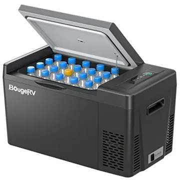 Show more The BougeRV 12 Volt Refrigerator is the ultimate solution for anyone seeking a reliable and efficient cooling option for all their adventures, be it camping, road trips, or boating. This portable 23-quart compressor cooler brings you cutting-edge Compressor refrigeration technology that guarantees remarkable cooling performance. In just 15 minutes, it can reduce temperatures to a chilling 32℉, and will reach a staggering -5℉ within 50 minutes. Say goodbye to the hassle of ice melting and soggy food, and revel in the peace of mind that your provisions are kept perfectly fresh and cold for days!