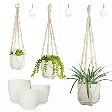 - Complete Set: Bundle includes three macrame plant hangers, matching pots, saucers, and ceiling hooks.