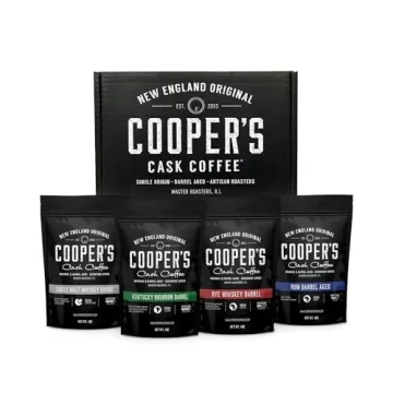 Show more Elevate your coffee drinking experience with the exceptional Bourbon & Whiskey Barrel Aged Coffee - 4-Bag Roasted Coffee Box Set. This luxurious gift set, containing four 4-ounce bags of whole bean coffee, delivers a rich tapestry of flavors for both coffee lovers and whiskey enthusiasts. Crafted by the renowned Cooper's Cask Coffee, each bag showcases unique blends inspired by the barrels that aging spirits often reside in. Indulge in the tantalizing flavors of Colombian Bourbon, Malt Whiskey Sumatra, Rye Whiskey Ethiopian, and Rum Barrel Rwanda, each promising an unforgettable sip with every brew.