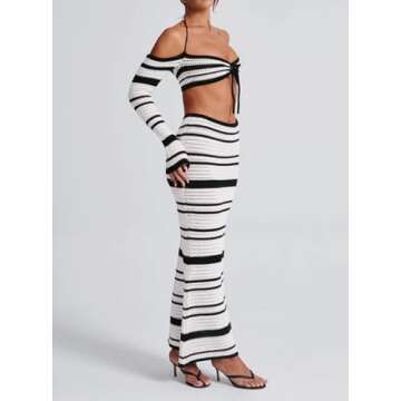 Bowanadacles Woman Summer Two Piece Stripe Print Knit Outfit Off Shoulder Long Sleeves Halter Neck Tie Up Top Bodycon Skirt (multi, S)