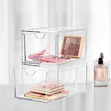 Boxalls 2 Pack Acrylic Stackable Storage Drawers Makeup Organizer, 20% Thicker Clear Bathroom Organizers for Cosmetics, Skin Care, Hair Accessories, Beauty, Vanity, Countertop and Dresser