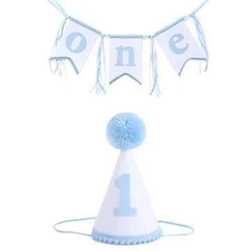 Boys 1st Birthday Hat and Highchair Banner - Blue and White Party Decoration (BAI LAN TAO CAN)