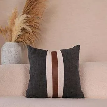 Show more Introducing the BOYSUM Farmhouse Decorative Outdoor Throw Pillow Cover – the perfect combination of rustic charm and modern sophistication. Crafted from sturdy faux leather and durable cotton, this 22x22 inch throw pillow cover instantly enhances your indoor or outdoor décor. Its striking brown faux leather stripe adds a vintage flair, making it a standout piece for your couch, sofa, or bed. With a convenient zipper enclosure, swapping out your pillow inserts is a breeze, and the pure black cotton fabric on the back ensures a chic yet understated look that fits seamlessly in any setting.