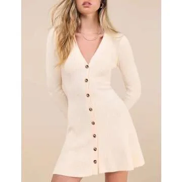 Bozanly Women's Elegant Deep V Neck Long Sleeve Button Front Ribbed Knit Mini Dress Sexy Sweater Dresses