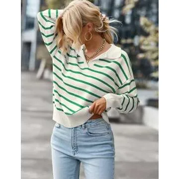 Show moreIntroducing the BQDCQB Women Striped Sweater Polo V Neck Long Sleeve Loose Sweater Knit Pullover Jumper Tops – a perfect blend of style and comfort designed for the modern woman. This sweater features a soft acrylic fabric that caresses your skin with its gentle touch, providing a cozy feel for autumn and winter. The beautifully crafted collar has reinforced suture for added durability, ensuring it withstands the test of time while maintaining a chic aesthetic. Available in a variety of stunning colors and sizes, this sweater caters to diverse tastes and preferences, making it a versatile addition to any wardrobe. Whether you're running errands or enjoying a casual get-together, this elegant piece is sure to turn heads.