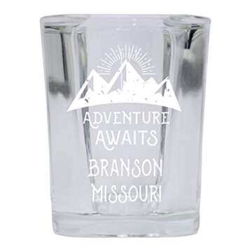 Branson Missouri Souvenir Laser Engraved 2 Ounce Square Base Liquor Shot Glass Adventure Awaits Design