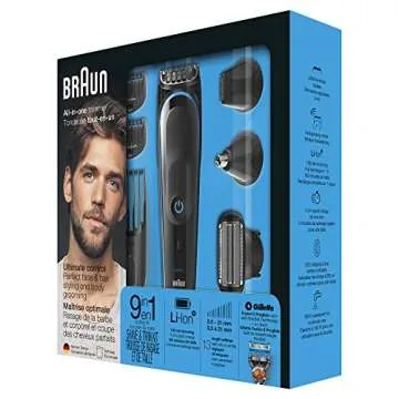 Show more Introducing the Braun 9-in-1 All-in-one Trimmer MGK5080, your ultimate grooming companion designed to cater to all your grooming needs with precision and style. This versatile trimmer features a robust design and functionality that allows you to maintain your beard, hair, and body hair effortlessly. With up to 13 length settings, this grooming tool ensures you can achieve any look you desire, from stubble to a full beard, making it perfect for men who value versatility in their grooming regime. Its sleek black and blue finish not only adds a modern touch but is crafted for durability, ensuring it stands the test of time.