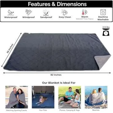 The blanket measures 82 x 55 inches, providing ample space for two people or a family picnic.