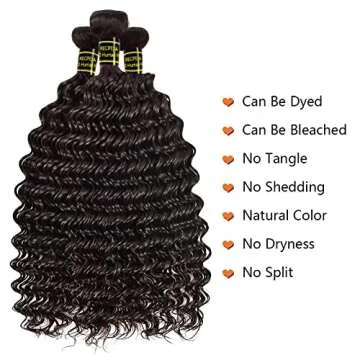Show more Introducing the incredible Brazilian Virgin Human Hair Deep Wave Bundles from a trusted brand that's committed to quality and customer satisfaction. Made from 100% human hair, these bundles are derived directly from young girls, ensuring that each strand is soft, healthy, and full of life. The unique deep wave pattern is not only visually stunning but also incredibly versatile, allowing you to style it as you would your natural hair. You can bleach, dye, or curl it according to your preferences while maintaining its integrity and charm.