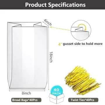 Bread Loaf Packing Bags with Ties, Large Bakery Homemade Bread Plastic Bags, 8” x 4” x 18”,40 Pack, Printed Bread Bags Reusable Adjustable