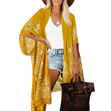 Show moreIntroducing a summer essential that redefines versatility and style. This women’s beach coverup features a unique mustard yellow boho floral print that effortlessly blends fashion with functionality. Crafted from an ultra-lightweight and breathable fabric, this coverup promises comfort throughout the warm weather. Its loose-fit design ensures that it flatters any body type, making it the perfect addition to your wardrobe. With dimensions of approximately 37.4in in length and 35.4in in width, this one-size-fits-most garment is designed to offer a relaxed fit, allowing freedom of movement without compromising on style.