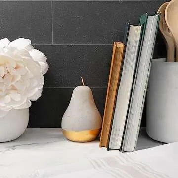 Show more Introducing the Brenium Decorative Concrete Pear, a stunning and modern piece of ornamental decor that effortlessly blends functionality with stylish aesthetics. Crafted with meticulous attention to detail, this pear-shaped masterpiece boasts a unique design, featuring a solid dark gray cement body with the bottom third elegantly dipped in radiant gold. Perfectly suited to elevate your living space, the Brenium Decorative Concrete Pear is ideal for console tables, mantles, or any area needing a touch of contemporary charm. Its substantial weight not only emphasizes its quality but also allows it to serve as a charming paperweight while showcasing your sense of style.
