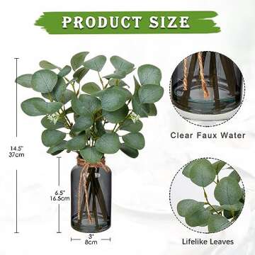 Briful Artificial Eucalyptus Stems in Black Glass Vase with Faux Water, 14" Fake Plant Eucalyptus Leaves for Home Office Farmhouse Wedding Centerpiece Décor