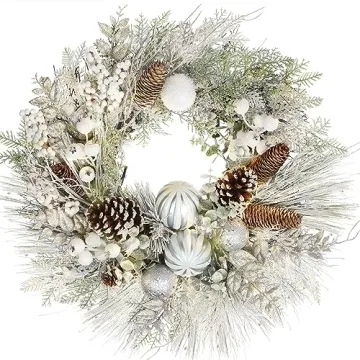 Show more Introducing the Briful Christmas Wreath, a stunning 24-inch (61 cm) festive decoration designed to elevate your holiday spirit! Handcrafted with a delightful combination of white berries, ball ornaments, glittering winter leaves, snow flocking needles, and charming pinecones, this wreath combines traditional holiday elements to create a warm and inviting ambiance. Perfect for your front door or as a centerpiece in your home, this wreath ensures that wherever it's displayed, it radiates the joy of the season. The meticulous attention to detail results in a striking visual that captivates both guests and passersby alike.