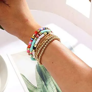 Bright Colorful Beaded Bracelet for Women Heishi Bracelets Set Gold Bead Stackable Stretch Strand Bracelet Bohemian Summer Bracelets Set (Rainbow gold)