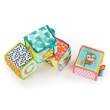 4 soft blocks feature a variation of crinkles, rattles & jingles