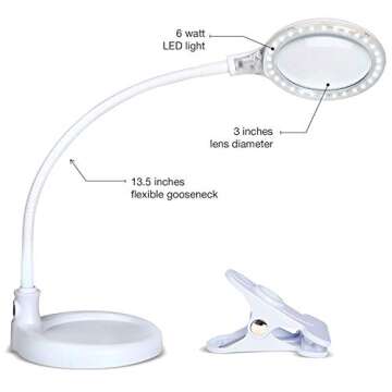 Show moreDiscover the power of detail with the Brightech LightView Pro Flex 2 in 1 Magnifying Desk Lamp. Designed with precision in mind, this innovative lamp combines a high-quality magnifying glass with adjustable LED lighting, making it an indispensable tool for anyone engaged in delicate tasks that require a sharp eye. Featuring a generous 3-inch genuine diopter glass lens, it offers a powerful 1.75X magnification, allowing you to work effortlessly on crafts, reading, sewing, or intricate projects. Say goodbye to eye strain with crystal clear visibility that keeps your focus sharp from a distance of just 13 inches. Enhanced by a durable construction that doesn't warp or scratch over time, this lamp promises a reliable companion for years to come.