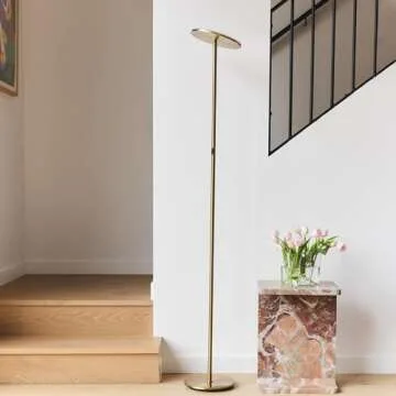 Show more The Sky LED floor lamp stands as a beacon of modern lighting technology, providing a wonderful blend of functionality and style that appeals to any interior decor. With an impressive 2190 Lumens and 26 watts of power, this floor lamp delivers vibrant illumination ideal for a wide range of activities including reading, writing, or simply unwinding after a long day. The warm white light at 3000K is specifically designed to create a cozy and comfortable atmosphere that your eyes will appreciate. Spanning over 7 ½ feet in length, the lamp's cord gives you the flexibility to place it anywhere in the room, whether it's cozying up in a corner or nesting beside your favorite chair, bed, or desk.