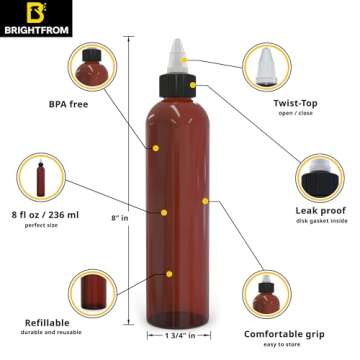 Show more If you're on the hunt for the ultimate applicator bottle, look no further than Brightform's versatile and sturdy squeeze bottles. Crafted from strong clear PET plastic materials and BPA-free, these bottles are designed with both safety and functionality in mind. Perfectly suited for a variety of uses, from hair coloring to arts and crafts, these bottles present a reliable solution for holding your favorite balms, lotions, and liquids. Each bottle features a twist open and close squeeze style top, which effectively eliminates leaks and spills, allowing you to dispense your products precisely and without mess.