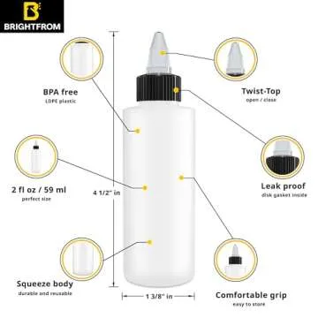Show more Introducing the BRIGHTFROM Twist Top Applicator Bottles, the perfect fusion of durability and functionality designed for both personal and professional applications. Crafted from premium high-density polyethylene (HDPE), these 2 oz bottles are not only robust but also completely safe for a variety of uses—from food condiments to arts and crafts. The BPA-free material ensures that you can store your favorite liquids without worrying about harmful chemicals leaching into your products. With a meticulous construction that withstands daily wear and tear, these bottles are your go-to solution for all dispensing needs.