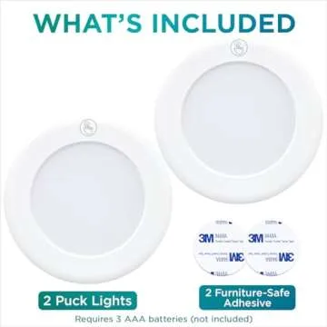 Show more Discover the perfect blend of functionality and elegance with these innovative LED Stick-On Cabinet Lights, designed to enhance your home lighting experience. These lights, brought to you by a trusted brand in home solutions, feature a simple installation process; simply stick them on any smooth surface and enjoy immediate illumination without the need for tools. Ideal for illuminating counters, cabinets, and dark corners, these versatile lights are equipped with LED puck technology that emits a warm white glow, adding a cozy ambiance to your spaces.