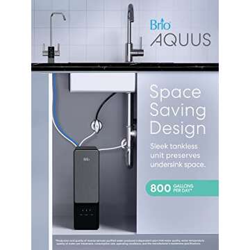 What sets the Brio AQUUS apart is its NSF/ANSI certified filtration, offering you peace of mind with every sip you take. It features a compact, sleek design that takes up minimal space under your sink, freeing up room for your kitchen essentials. Measuring at just 5.2” W x 16.6” H x 18.2” D, it occupies about 30% less space than conventional systems, while the tankless attribute ensures you won't deal with stagnation or contamination.