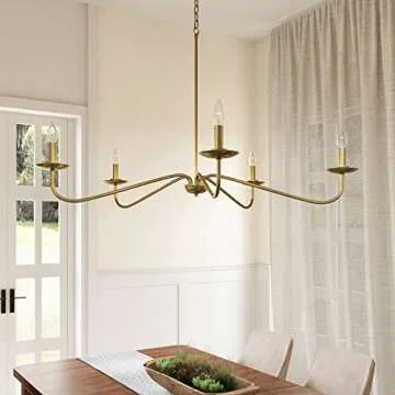 Show more Transform your living space with this exquisite 5-light gold steel chandelier that perfectly marries traditional elegance with modern sophistication. Designed with careful attention to detail, its thin center stem offers a sleek upgrade from the usual bulky chains, ensuring a clean and refined look that complements various decor styles. The proportional attachments enhance its aesthetic appeal, making it a stunning centerpiece in any room.