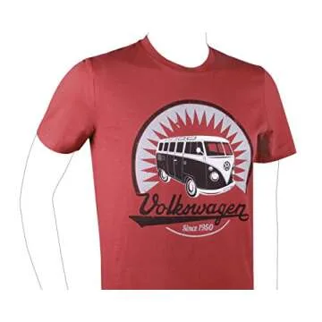 BRISA VW Collection - Volkswagen Unisex Short Sleeve T-Shirt with T1 Bus Motif in Cotton (Vintage Logo/Red/Size L)