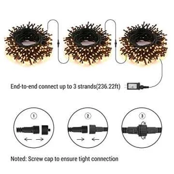 Show more Transform your space into a glowing wonderland with our exquisite End-to-End Connectable Warm White LED String Lights. Measuring a magnificent 78.74ft and featuring 240 LEDs, this enchanting string light is designed for easy end-to-end connections with a safe male and female plug, allowing you to connect up to three strands—up to a stunning maximum of 720 LEDs over 236.22ft. Perfect for all your festive needs, these lights will bring a radiant touch to any décor.