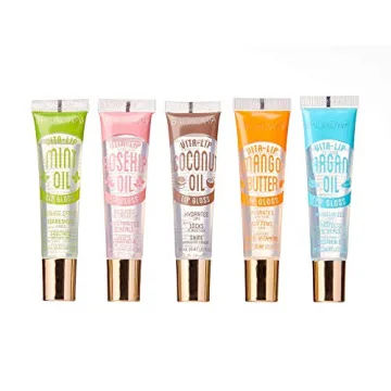 The set includes five different lip glosses with unique flavors: Mint Oil, Coconut Oil, Rosehip Oil, Mango Butter, and Argan Oil.