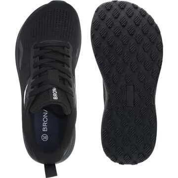 Show moreIntroducing the BRONAX Wide Shoes for Women, the ultimate blend of comfort, style, and performance, designed specifically for the active woman on the go. These sneakers feature a spacious wide toe box ensuring your feet can wiggle freely while perfectly accommodating various foot shapes. Enhancing the overall experience, they are equipped with a high-rebound EVA midsole that provides exceptional support and shock absorption, as well as a durable rubber outsole with grooves to offer excellent flexibility and traction. Weighing in at only 9.2 oz (Size 7), these lightweight shoes promise to keep your feet feeling free and energized, making them perfect for tennis, running, or any training activities. Available in a sleek all-black design, these shoes will complement any athletic outfit you choose.