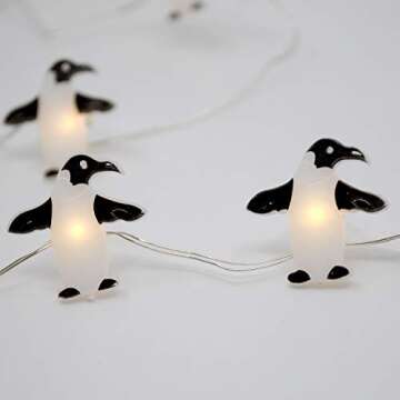 Show more Illuminate your space and transform your surroundings with the Brooklyn Lighting Company 12 Foot LED Wire Lights Strip featuring charming 36 penguin-shaped bulbs. These delightful string lights are designed to spread warmth and cheer while adding a whimsical touch to any environment. Perfect for various settings, whether it's draping them over your mirrors or enhancing the ambiance at celebrations, these lights offer endless possibilities. The 12-foot length provides ample coverage, making them versatile for indoor or outdoor use, and their lightweight, battery-operated design ensures that you can place them wherever you envision a cozy glow.