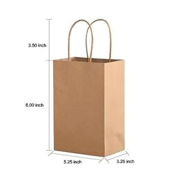 Show more Introducing the Brothersbox Small Brown Paper Bags With Handles—a perfect blend of sturdiness and sophistication. Made from premium 110g basis weight kraft paper, these bags stand out for their impressive durability and fine construction. With neatly crafted paper twist handles, they not only ensure a comfortable grip but also guarantee a reinforced design that won't fall apart during use. With dimensions of 5.25x3.25x8 inches, this bulk set includes 50 stylish bags, making it the ideal choice for any occasion—be it gifting, retail, or parties!