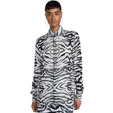 Yes, it features a distinctive tiger print, long sleeves with button cuffs, and a collared neck for a polished look.