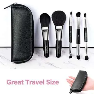 Show more The ultimate travel companion for makeup enthusiasts, this portable makeup brush set is designed to deliver beauty on the go. Compact and lightweight, it fits snugly in your hand, resembling the size of a smartphone, making it perfect for travel, business trips, or everyday use at home. With a double-ended design, this set includes 5 cute brushes that offer 8 different application techniques. Whether you're working on foundation, powder, eyeshadow, blending, highlighting, bronzing, or defining your lips and eyebrows, these brushes have got you covered.