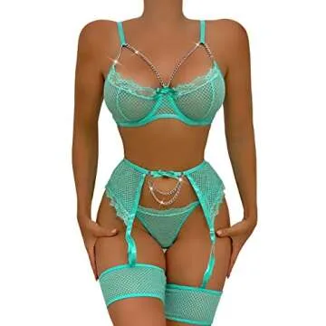 BSJYIFAN Garter Lingerie for Women,Sexy Lace Lingerie,Fishnet Matching 4 Piece Lingerie Set (Green, Large)