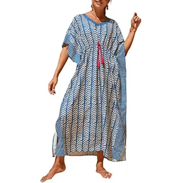 Bsubseach Kaftan Dresses for Women Plus Size Swimsuit Cover Up Long Caftan Dress with Waist Drawstring Blue Stripe