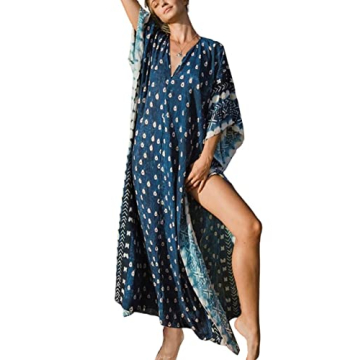 Bsubseach Women Plus Size Kaftan Maxi Dress Summer Print Beach Bathing Suit Cover Up Dress Caftan Robe A-Blue