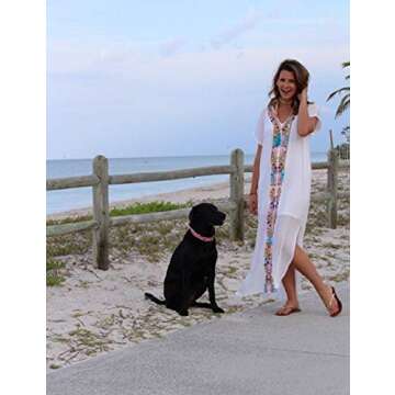 Bsubseach Women's White Embroidery V Neck Short Sleeve Rayon Swimsuit Cover Up Tunic Split Long Maxi Dress Kaftan