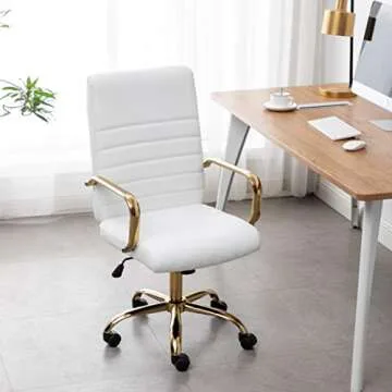 Introducing the stunning BTEXPERT Ergonomic White Faux Leather Adjustable Home Office Arm Chair with a gleaming golden finish, meticulously designed to bring both elegance and comfort into your workspace. This exquisite chair features a unique blend of chic PU leather and a robust metal frame, making it a stylish and functional addition to any home office, studio, or living area. With dimensions of 23.5D x 22W x 42.5H, it fits perfectly in compact spaces...