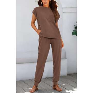 BTFBM 2 Piece Outfits for Women Ribbed Knit Lightweight Matching Lounge Sets Cap Sleeve Top and Elastic Waisted Pants(Solid Coffee,Medium)