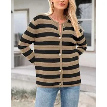 Show more This Striped Cardigan Sweater from BTFBM is an absolute wardrobe essential for women who appreciate both style and comfort. Designed with a modern twist, this open-front cardigan features a trendy striped pattern that's perfect for layering. Crafted from a blend of soft and warm materials, it offers the ideal level of coziness to keep you snug throughout the cool seasons. Its crew neck design and long sleeves provide coverage and warmth, making it suitable for spring, fall, and winter wear.