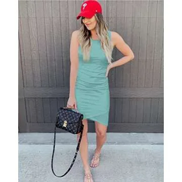 BTFBM Women 2024 Summer Sleeveless Tank Dresses Crew Neck Slim Fit Short Casual Ruched Bodycon Party Club Mini Dress(106Green, Medium)