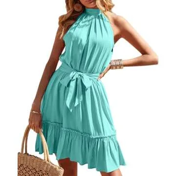 BTFBM Women 2025 Halter Neck Summer Dresses Casual Sleeveless Floral Polka Dot Print Ruffle Mini Boho Beach Sun Dress(Solid Lake Blue, Small)